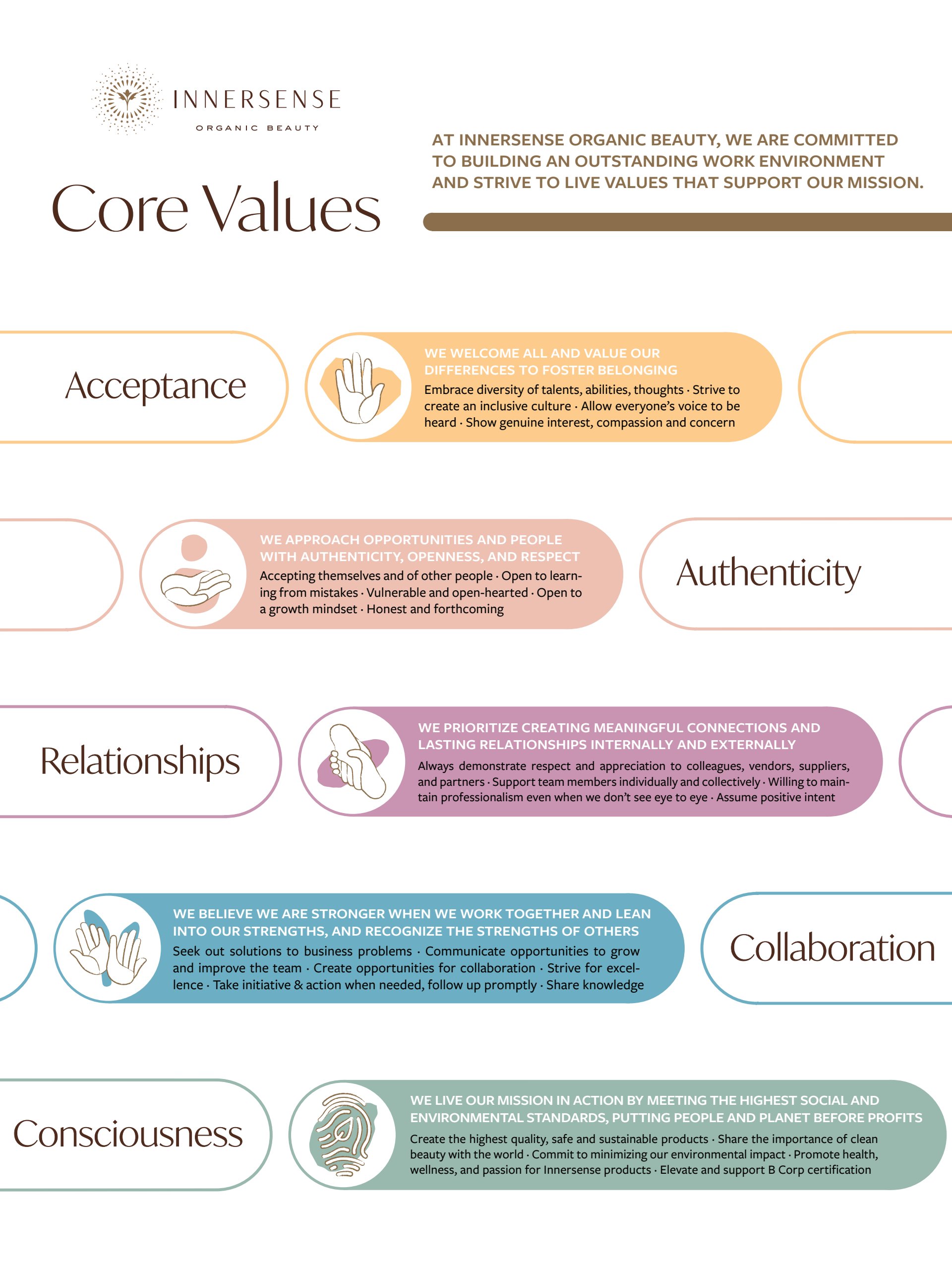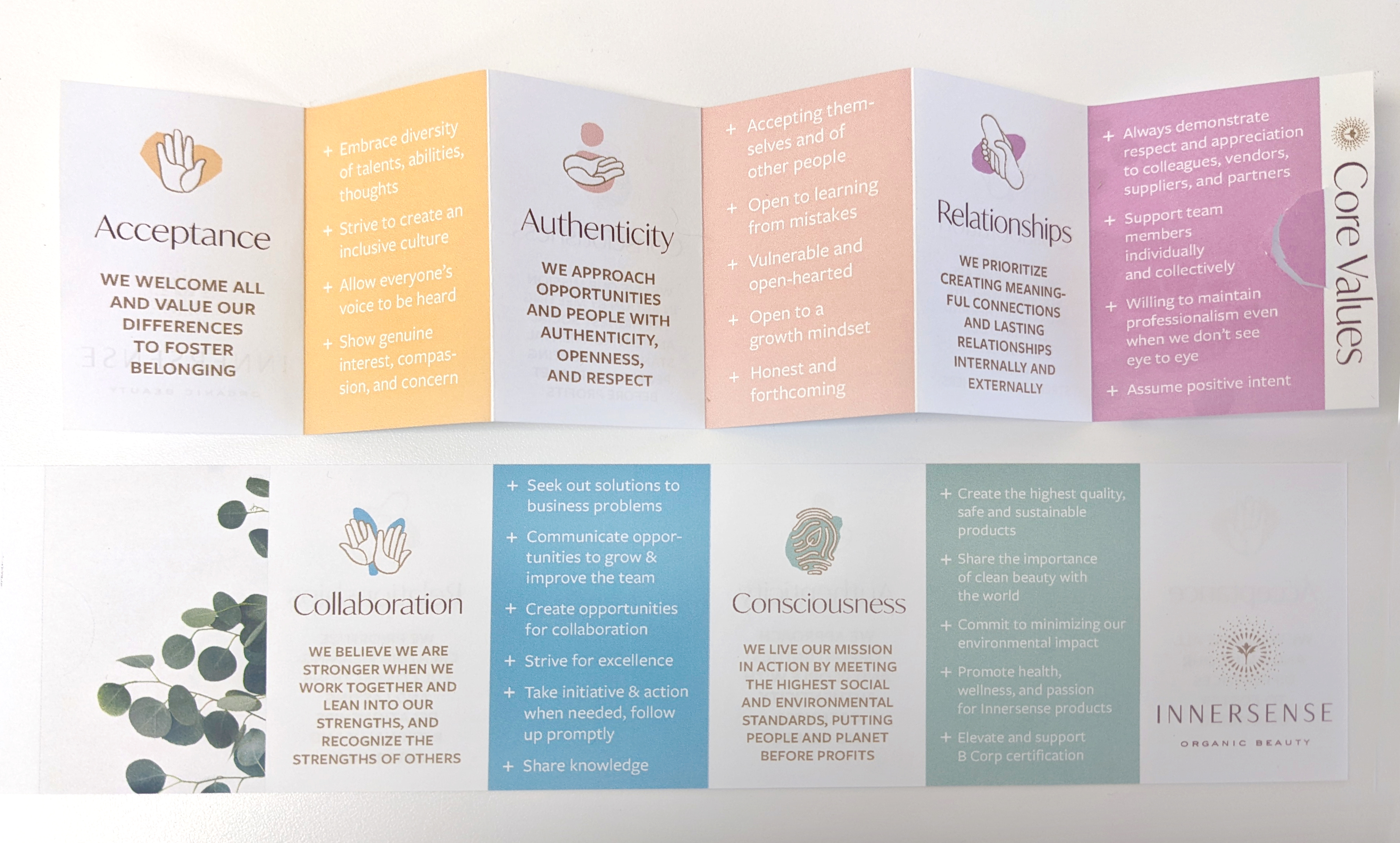 Original icon illustrations and poster design for company brand values. Custom accordion booklet for employees.