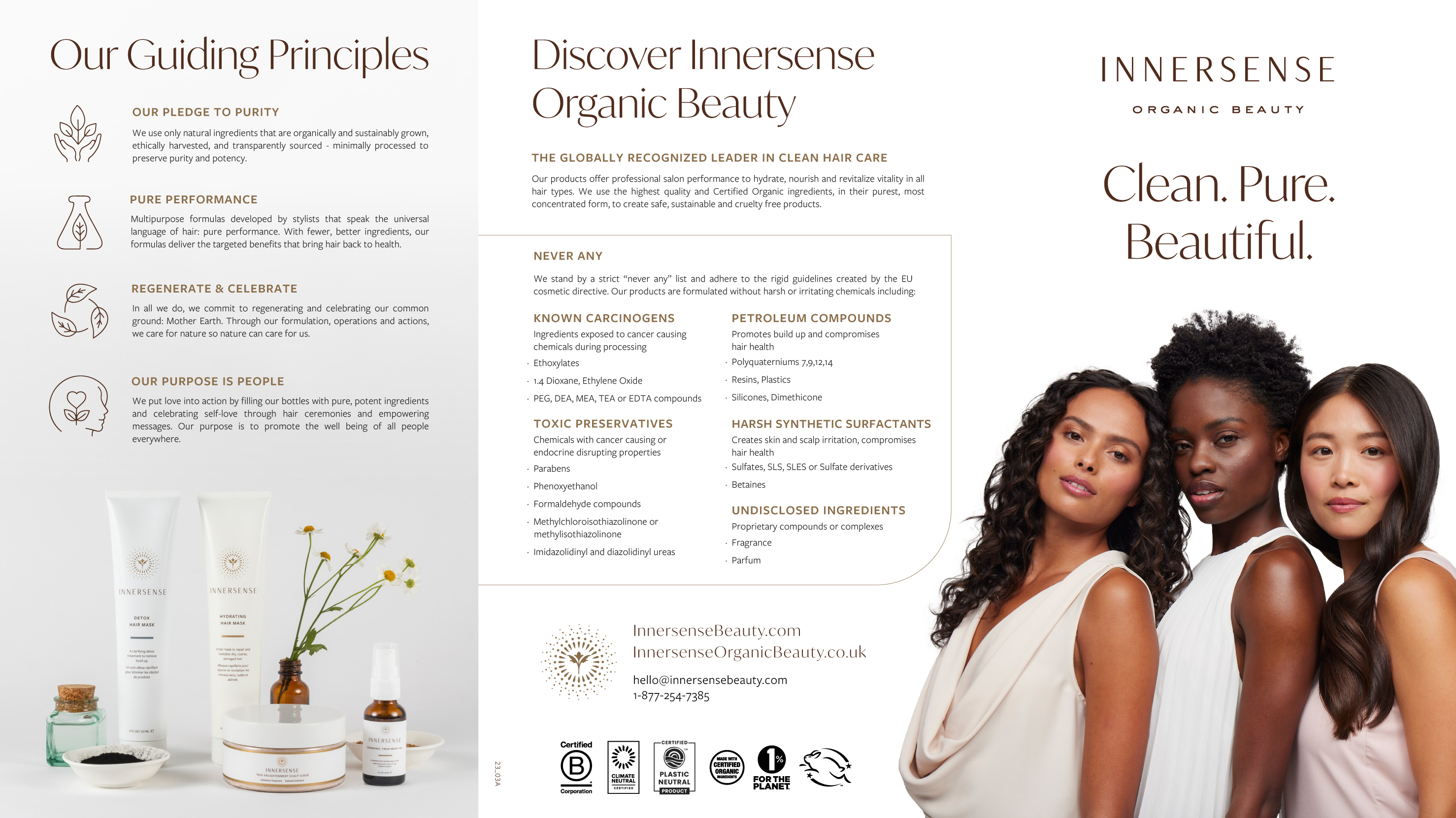Elegant, upscaled design for a B2C product brochure. Custom icons add weight and emphasize meaning to highlight core brand principles. Refined interior layout aids legibility. Additional versions for B2B and Spa audiences.